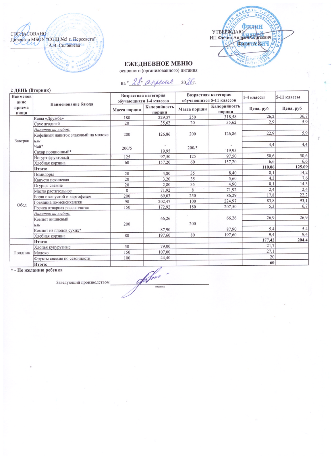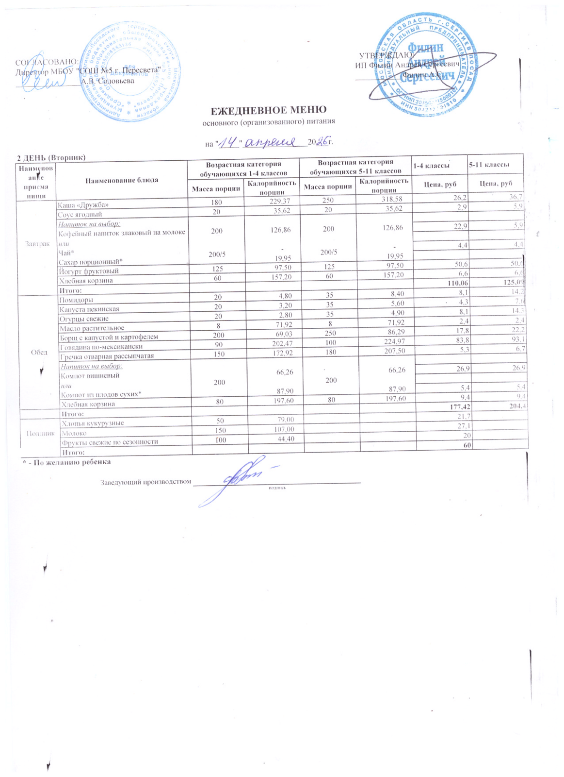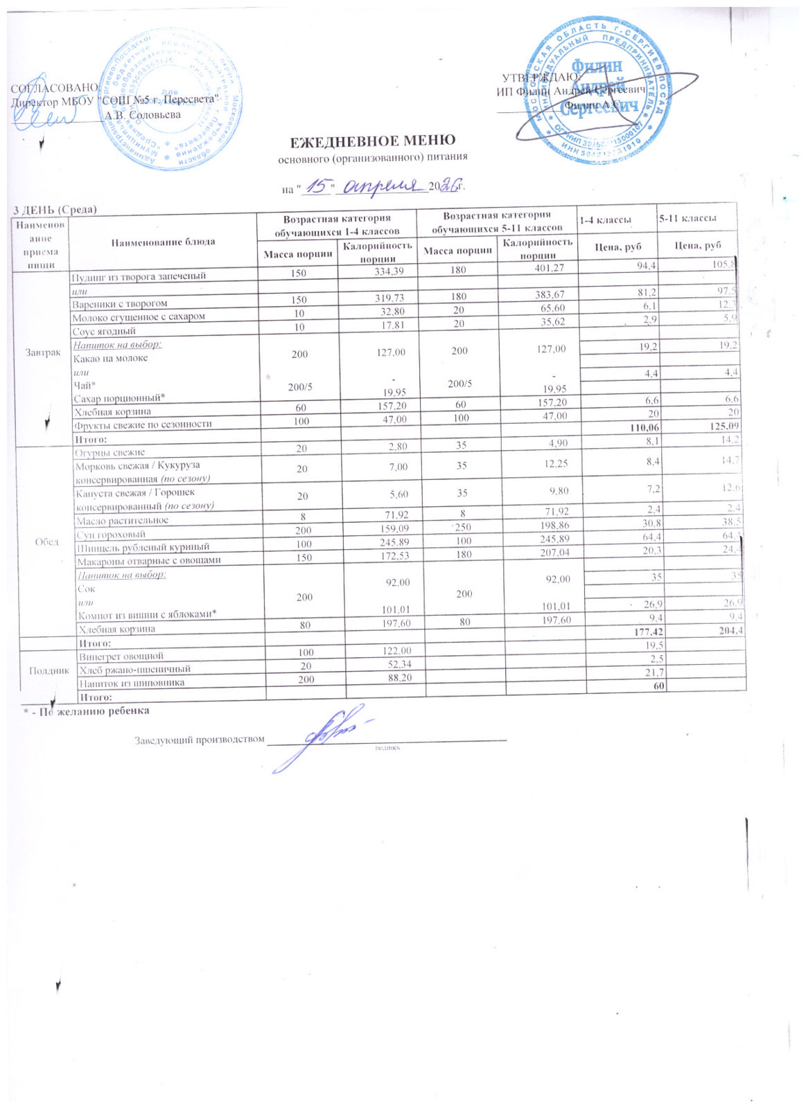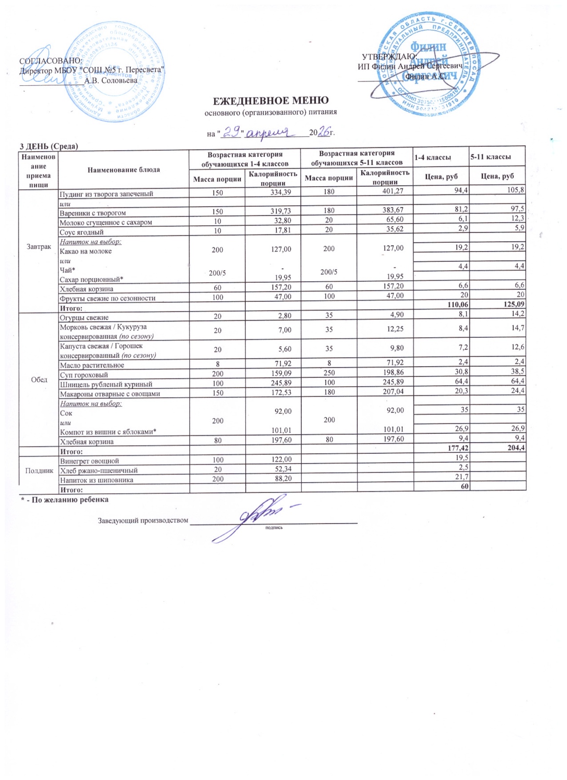 - Организатор питания, получивший право на организацию питания детей в школе в результате конкурсных процедур в соответствии с федеральным законом №44-ФЗ - ИП Филин Андрей Сергеевич +7 903 750 14 41