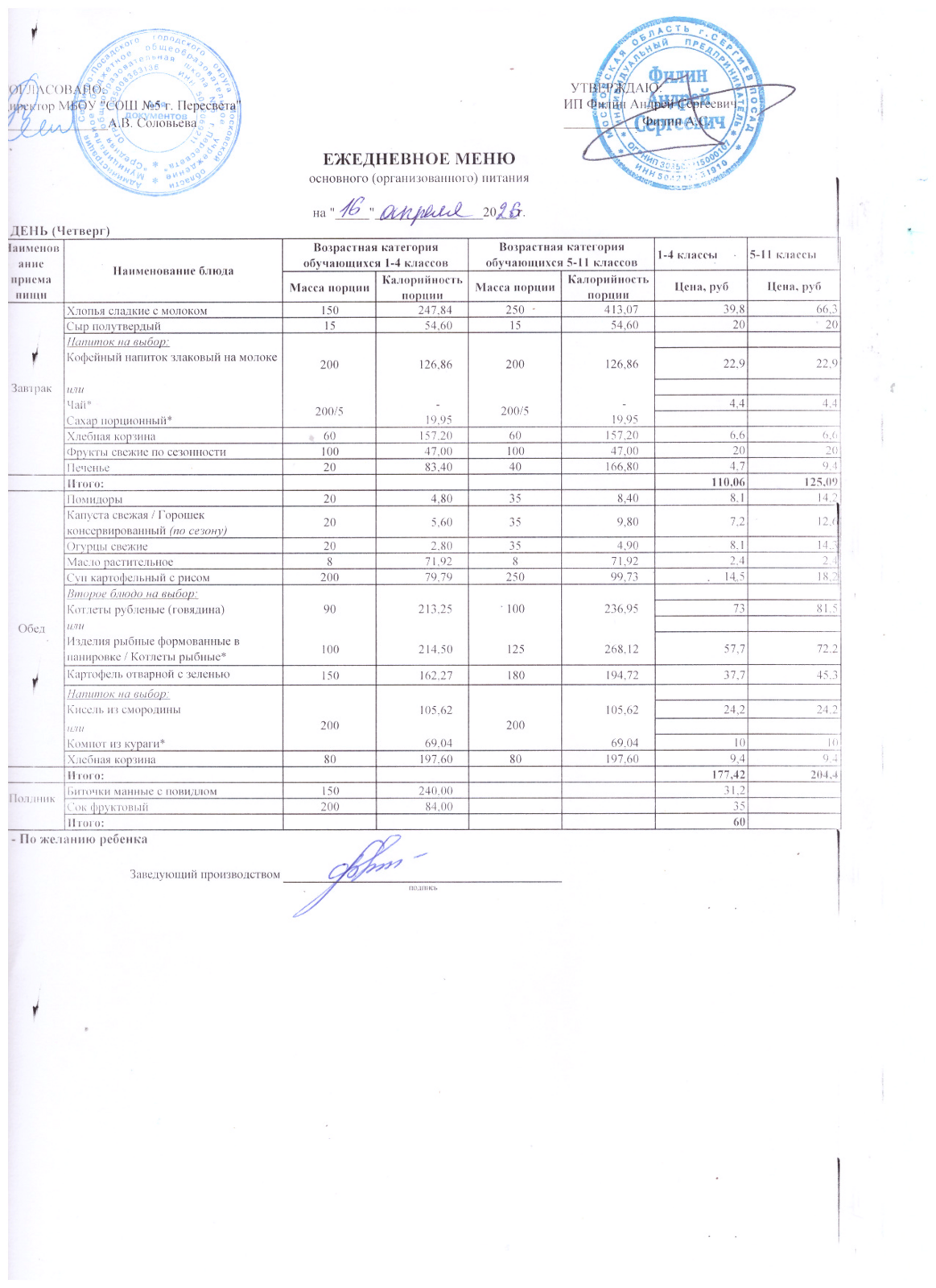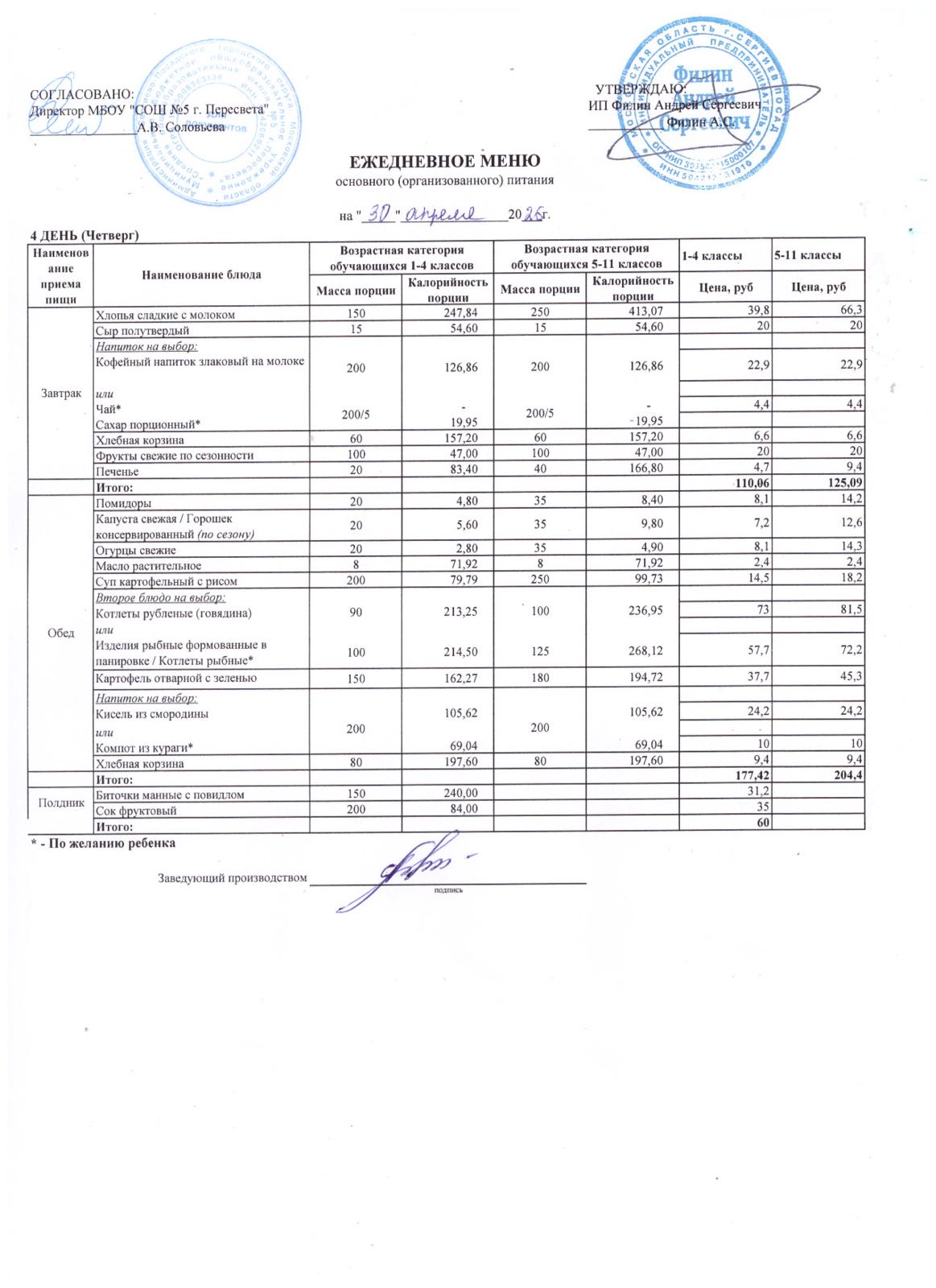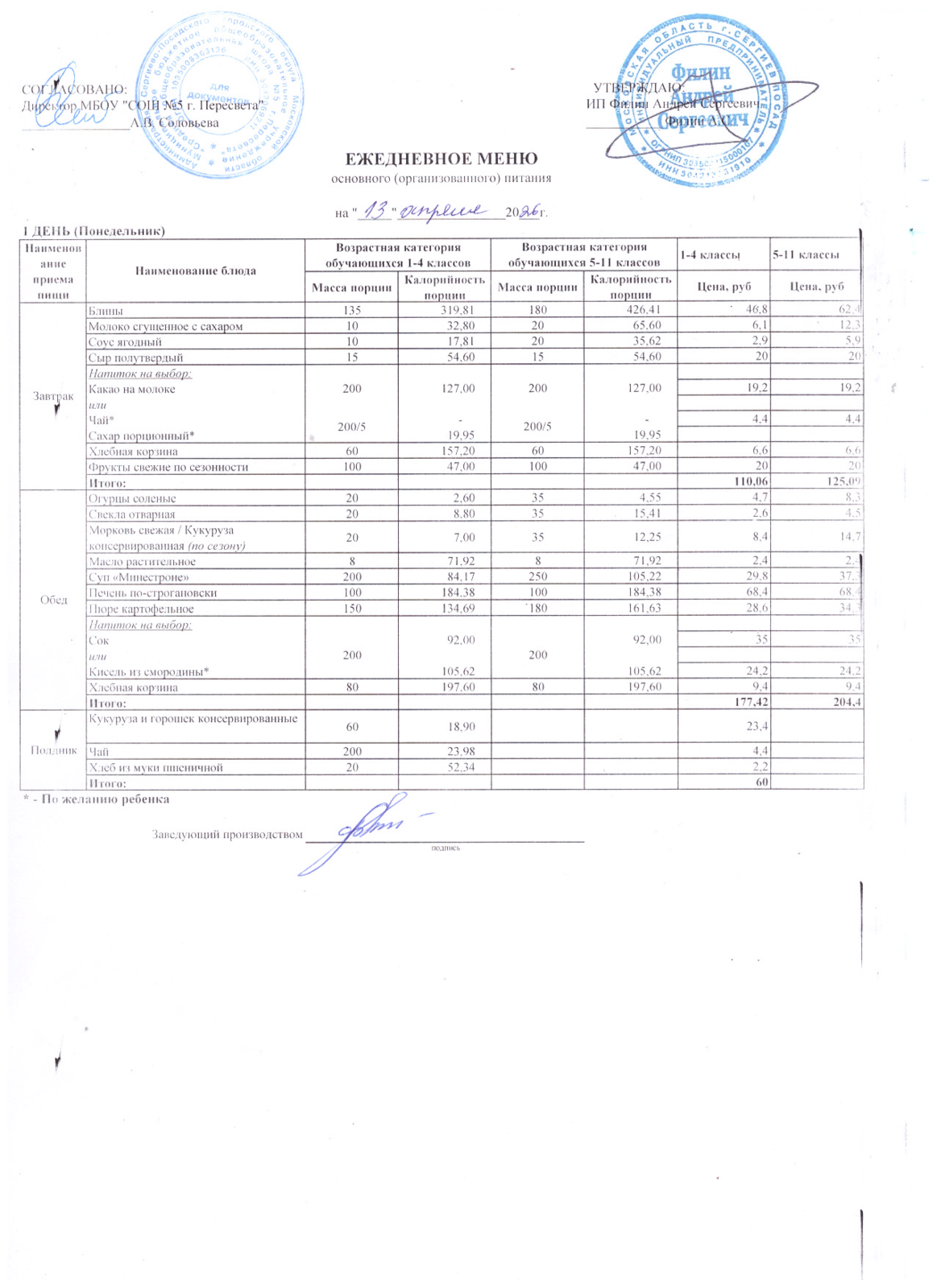 - Организатор питания, получивший право на организацию питания детей в школе в результате конкурсных процедур в соответствии с федеральным законом №44-ФЗ - ИП Филин Андрей Сергеевич +7 903 750 14 41