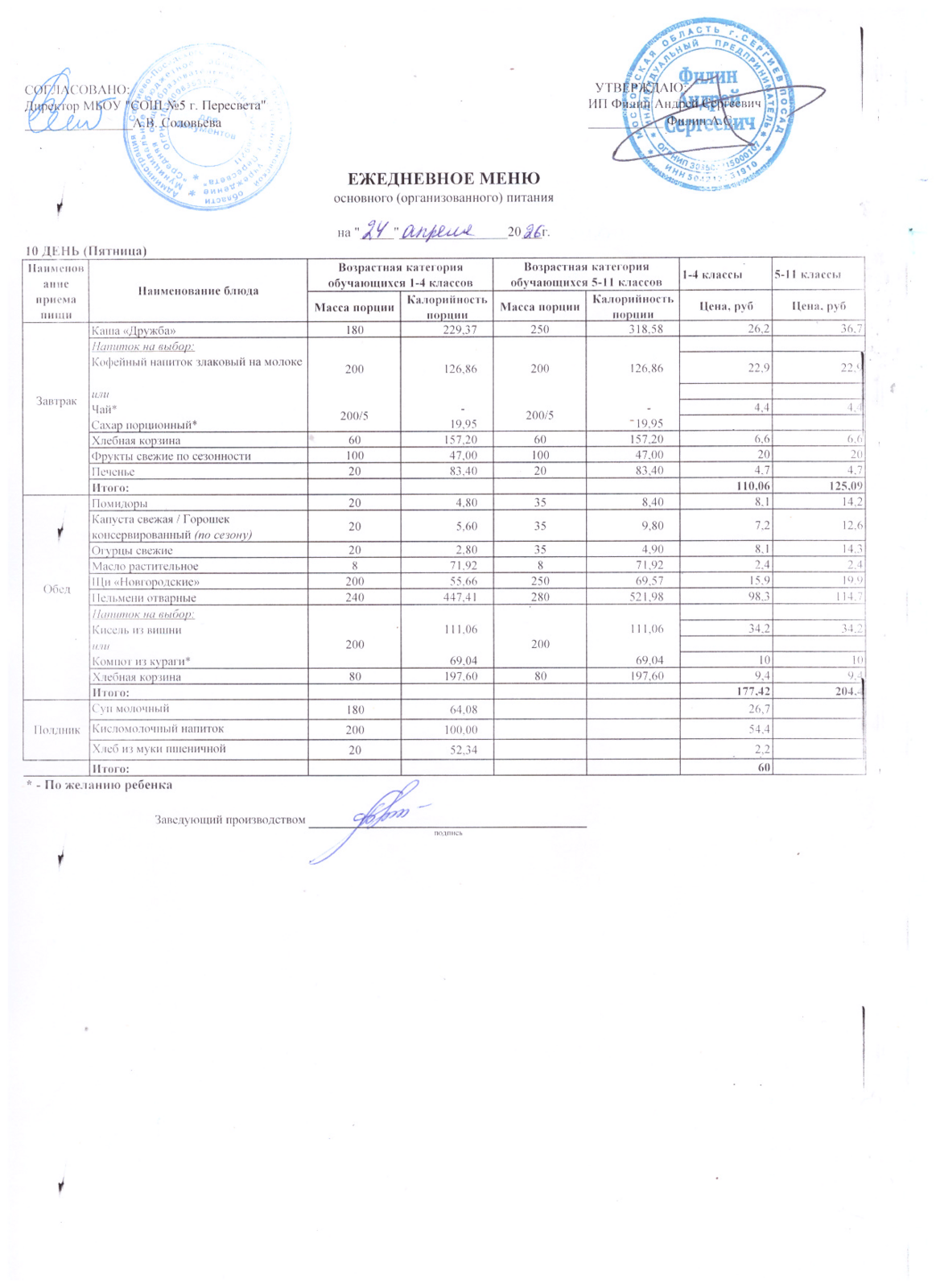 Ежедневное меню на 2025-2026 уч.год.: